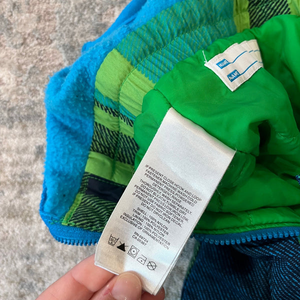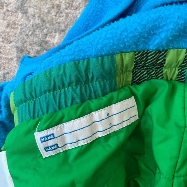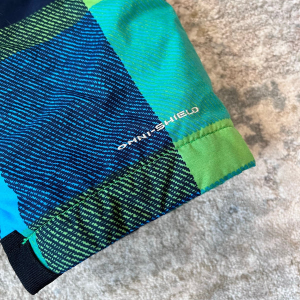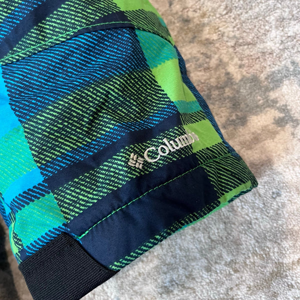 Columbia Blue Green Plaid Snow Bib Overalls. Toddler boy size 2T. Overalls style snow pants have soft fleece top, elasticized waist, boot gaiters, center zipper, interior ID label, adjustable velcro straps on the shoulders, and waterproof omni-shield construction. Great condition with no flaws noted!