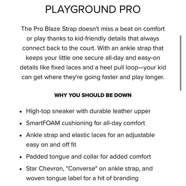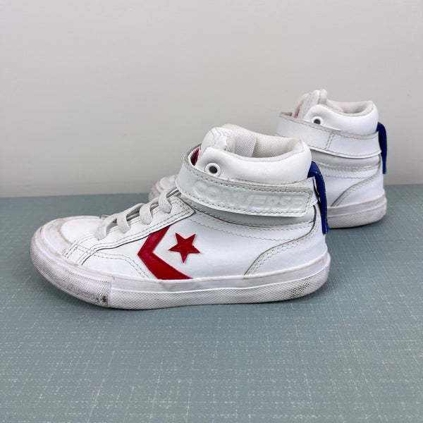 Converse Pro Blaze Strap Retro Sport High Top Kids Sneakers White Red. Boy or girl shoe size 13. Features durable leather upper, SmartFOAM cushioning, ankle strap and elastic laces for easy on/off, padded tongue and collar, and fun red star chevron design. Great condition; just has light marks from the one of two times my kiddo wore.