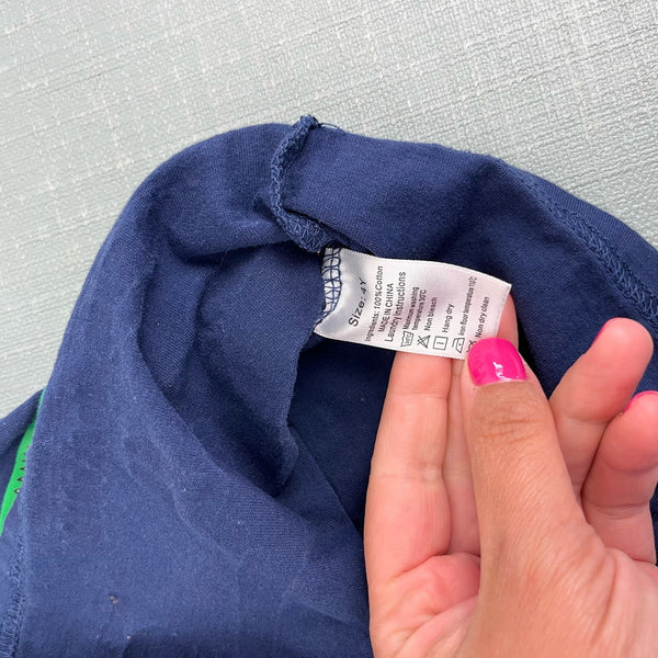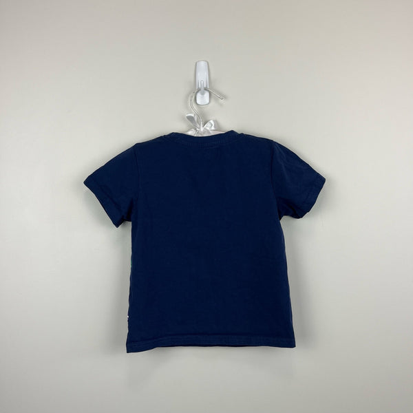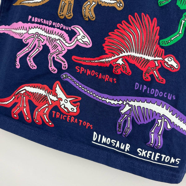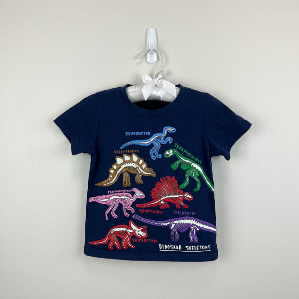 Educational Graphic T-Shirt Starboard Blue Dinosaur Skeletons. Toddler boy or girl size 4T. No brand; nearly identical to Mini Boden tee (see last two photos). Casual short sleeve navy blue top with colorful dinosaur bones - triceratops, tyrannosaurus, stegosaurus, and more!
