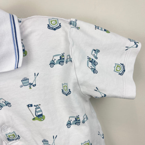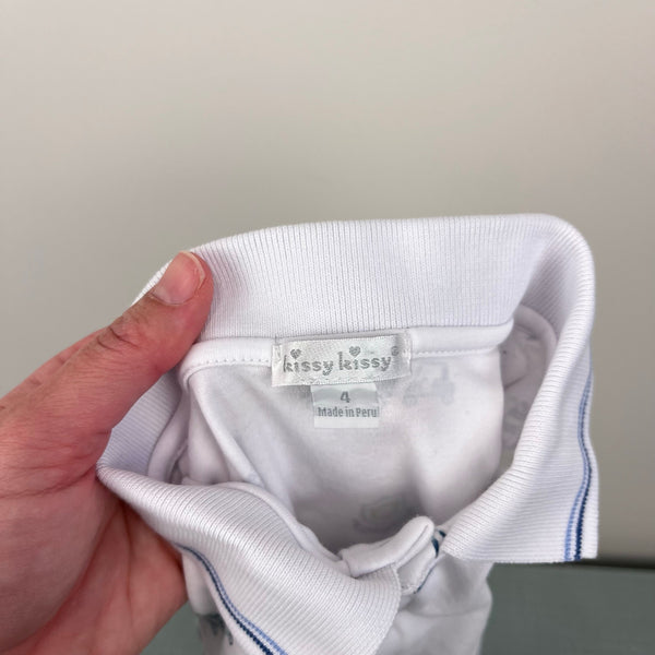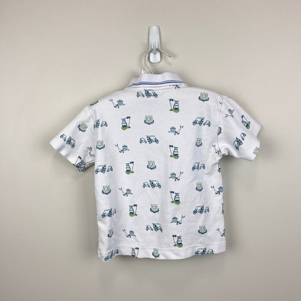 Kissy Kissy Golf Club Blue Bermuda Polo Shirt. Toddler boy size 4T. Super soft pima cotton short sleeve collared top. White with pastel blue and green print with golf carts, clubs, and more. Navy and light blue stripes on collar. Button placket. Great condition with no flaws noted.