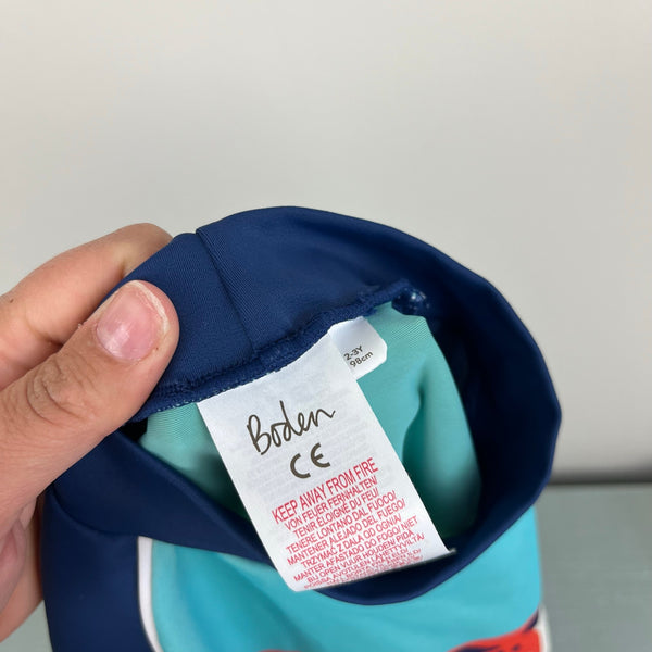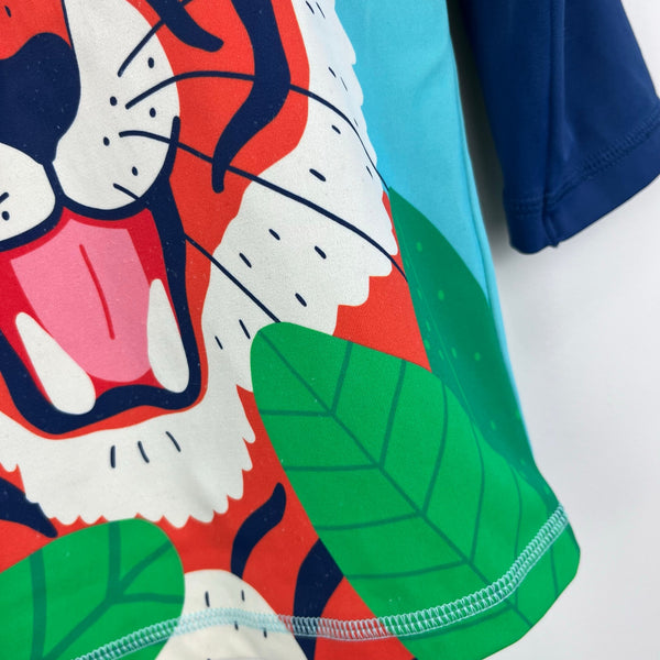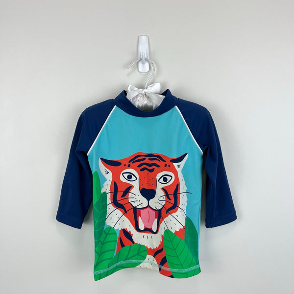 Mini Boden Rash Guard Swimsuit Top Firecracker Orange Tiger. Toddler boy size 2-3 years. UPF 50+ protection. Long sleeve bathing suit shirt in navy and blue with fun tiger on the chest. Fabric has light wear; see close up photos.