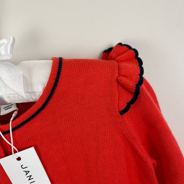Janie and Jack Girls Ruffle Cardigan Sweater. Toddler girl size 2T. Brand new with tag (NWT). Bright red cardigan sweater with navy trim at collar, cuffs, and shoulder ruffles.