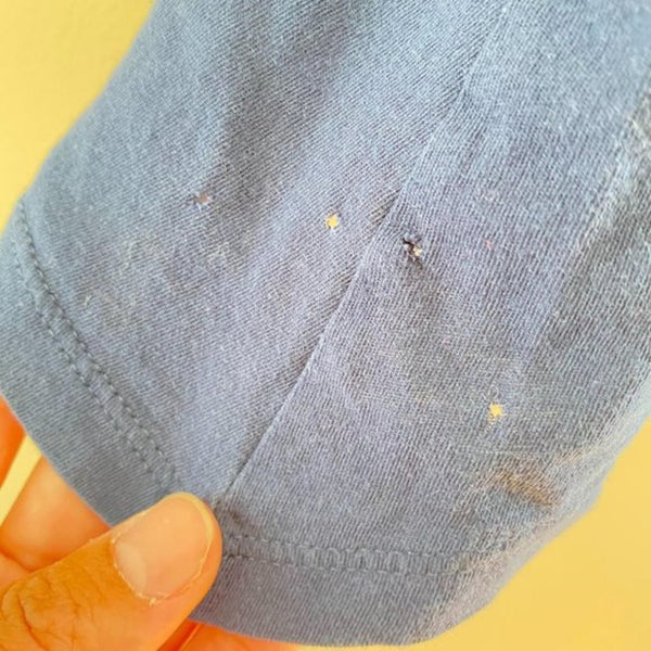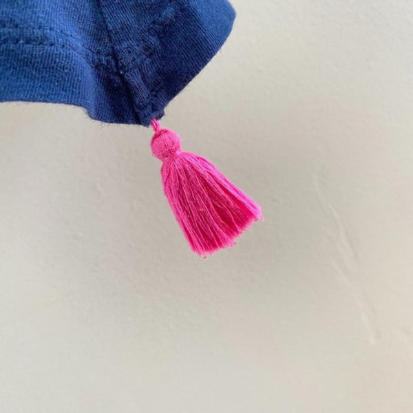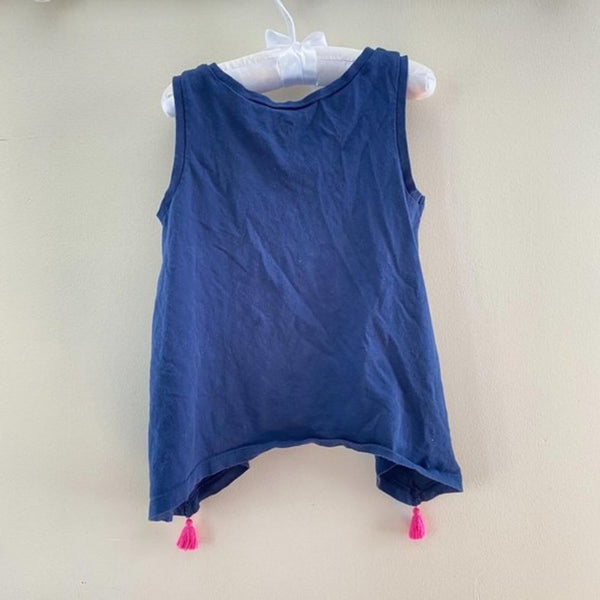 Toddler girl size XS (4-5 years). Casual sleeveless top is perfect for pairing with shorts for every day play in the summer. True navy, not washed out as it appears in close up photos. Nice swingy shape. Has a few teeny tiny holes on one side (see last photo; they don't affect wearability at all and can't be seen unless searching). Fun pink tassels hang from the bottom.