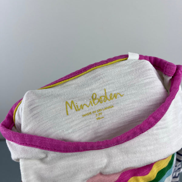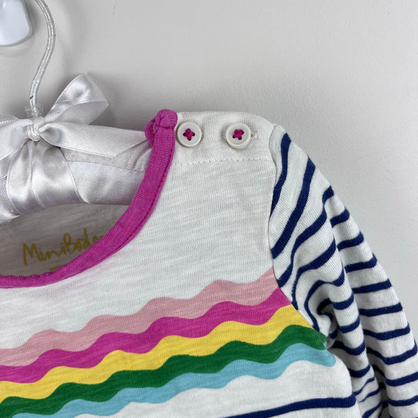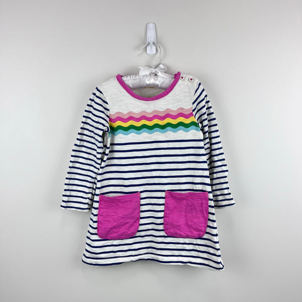 Mini Boden Fun Pocket Jersey Dress Navy Ivory Rainbow Wave. Toddler girl size 2-3 years. Cozy long sleeve dress in navy blue and white stripes with zig zag rainbow across the chest and bright pink pockets. Buttons on the shoulder for easy on/off. Perfect for back to school! Great condition with no flaws noted.