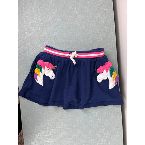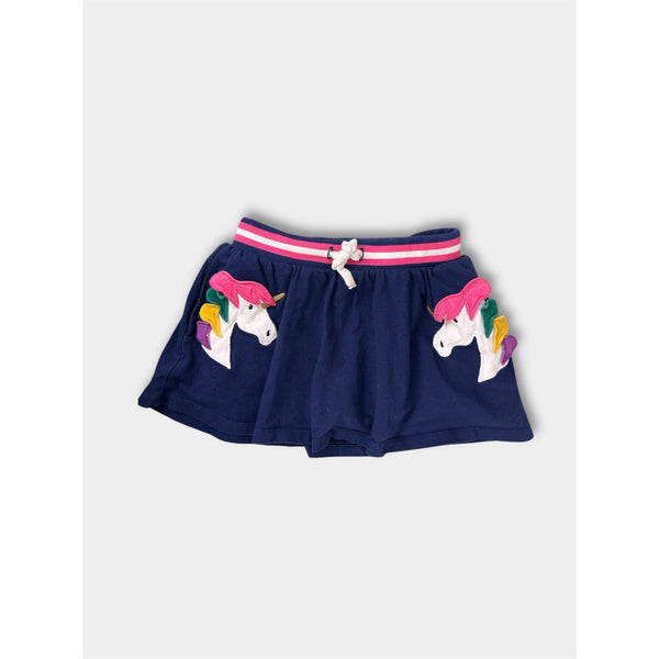 Mini Boden Unicorn Applique Skort College Navy. Toddler girl size 4-5 years. Pull on navy blue skirt with shorts hidden underneath. Soft ribbed drawstring waist. Rainbow main on the unicorns. Has pockets!