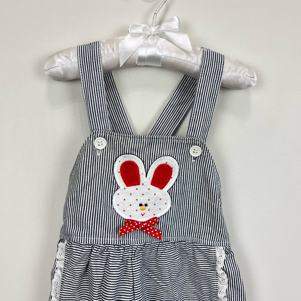 Vintage Buster Brown Striped Bunny Overalls. Toddler girl size 4T. Made in the USA. Striped overalls in a great bubble shape with the cutest red and white polka dot bunny rabbit applique on the bib. White eyelet ruffle detail on the legs and elastic in the back. Great condition with no flaws to note!