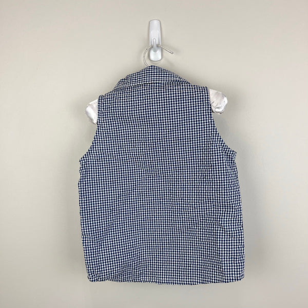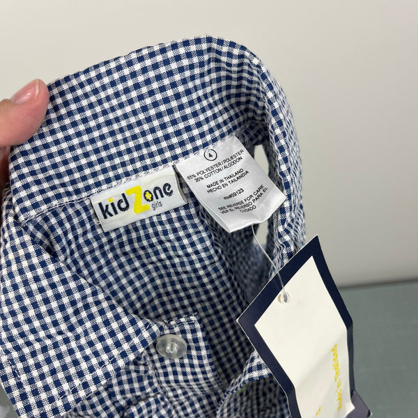 Vintage Kid Zone Ruffle Gingham Plaid Sleeveless Shirt. Toddler girl size 4T. Dead stock, brand new with tag (NWT), though does have a tiny spot on the back (see last photo; untreated). Collared button up tank blouse in navy blue and white seersucker plaid. Embroider yellow flowers down the front with ruffles.