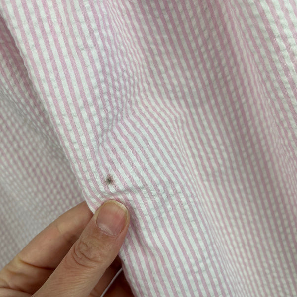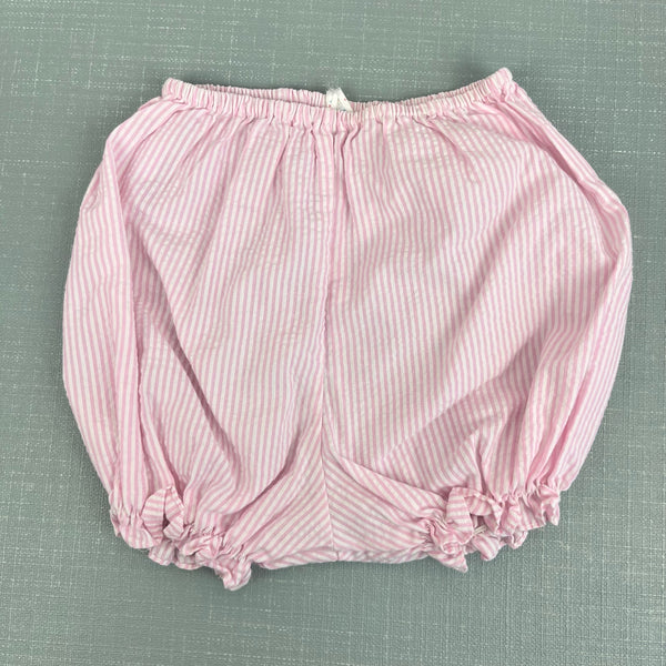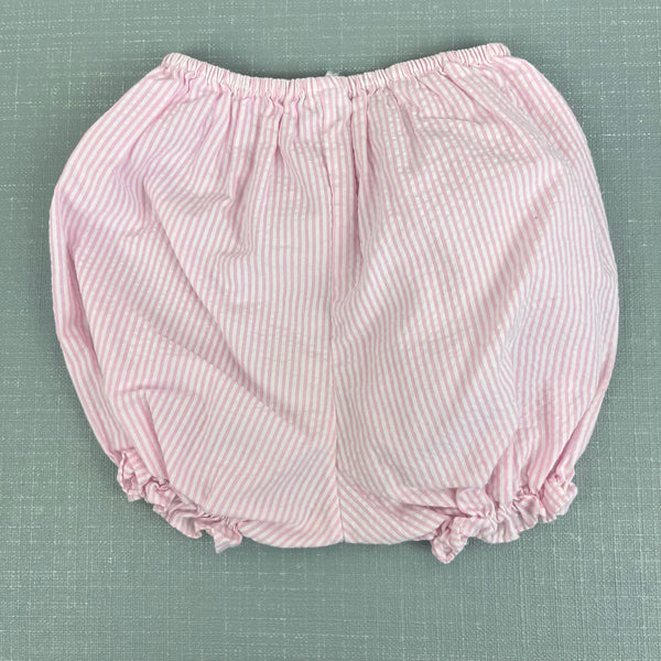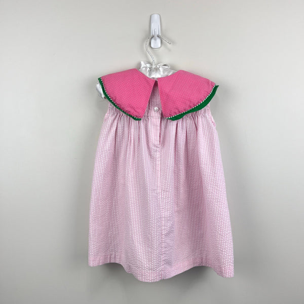Vintage Samara Pink Seersucker Watermelon Dress. Toddler girl size 4T. Sleeveless dress in light pink and white stripes. Fun watermelon bib collar. Buttons in the back. Small mark (see last photo; untreated). Includes matching bloomers. Perfect for summer!