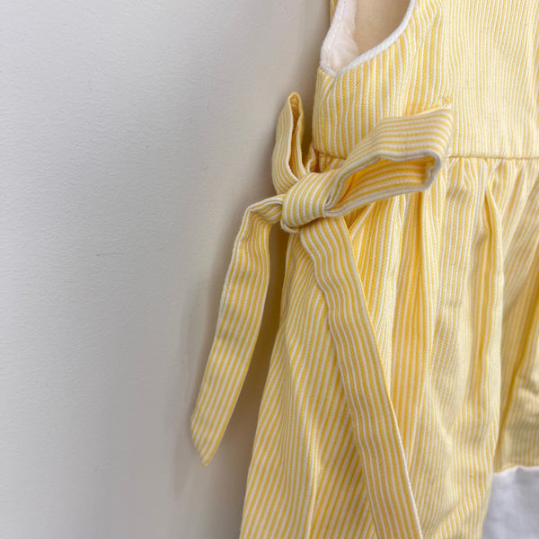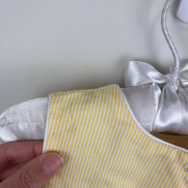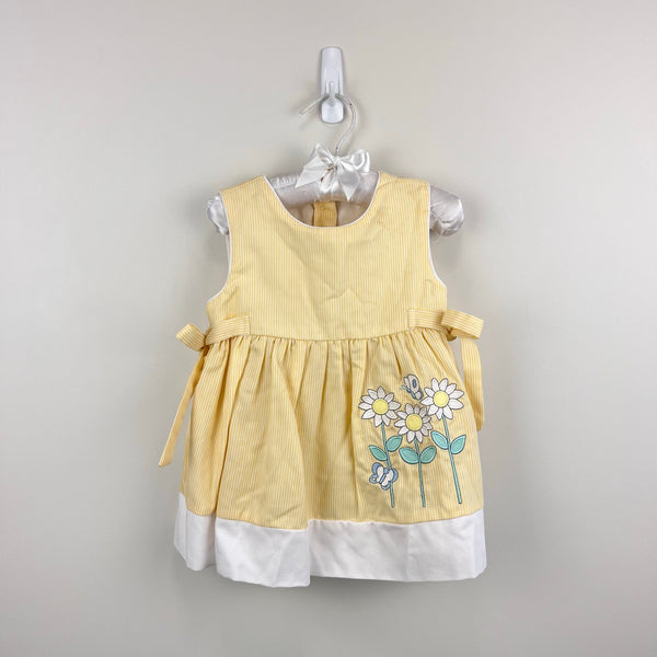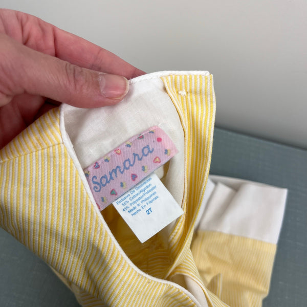 Vintage Y2K Samara Yellow Seersucker Striped Flower Butterfly Dress. Toddler girl size 2T. Sleeveless yellow dress with white pinstripes. Features bows on the sides and embroidered flowers and butterflies on the skirt. Button back. Has scattered light marks (untreated; see photos).