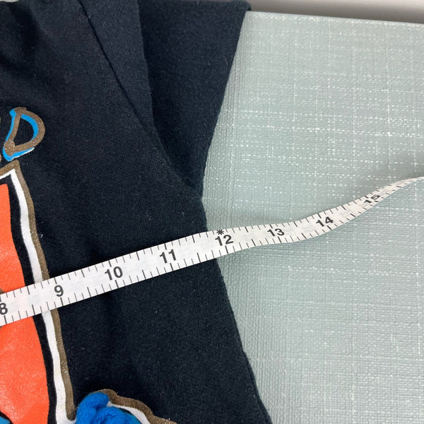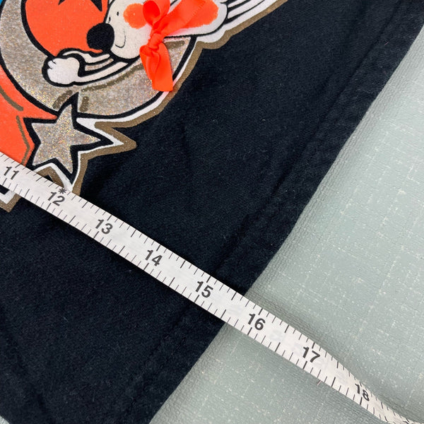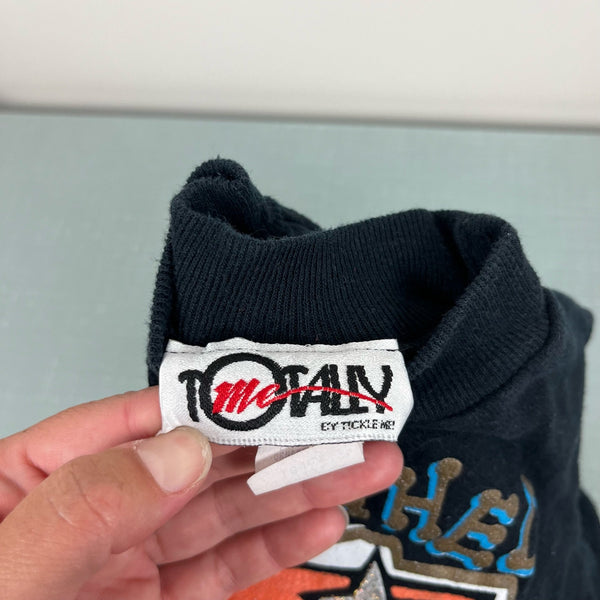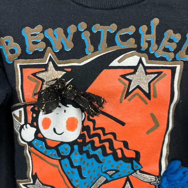 Vintage Totally Me Bewitched Halloween Sweatshirt. Toddler girl size 4T. USA made. Black crewneck sweatshirt with Halloween themed design - a witch on a broomstick, her cat, and silver stars. Fun 3-D embellishments. Light wear and a mark on the sleeve.