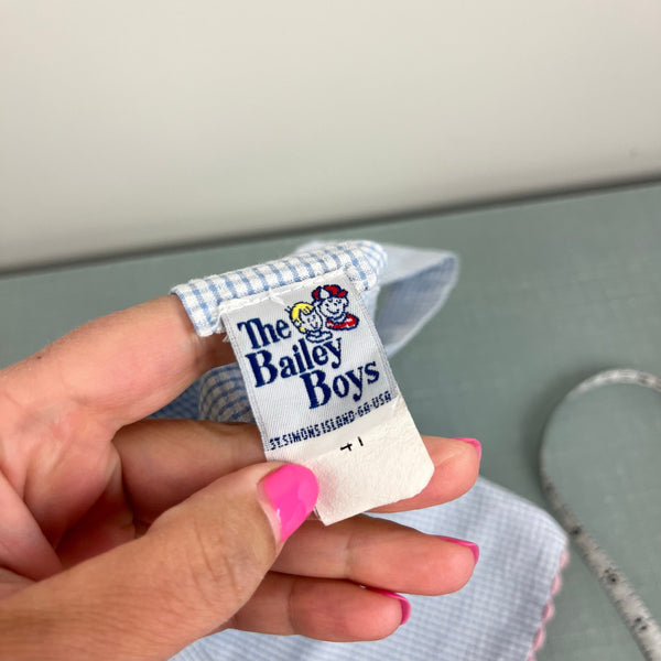 Vintage The Bailey Boys Blue Gingham Applique Ice Cream Dress. Toddler girl size 4T. USA made. Sleeveless tank top dress can be worn pinafore overalls style with a shirt or as-is for hot summer days! Light blue and white plaid pattern with pastel polka dot ice cream cones on the center. Adjustable button straps. Lined. Great condition with no flaws noted!