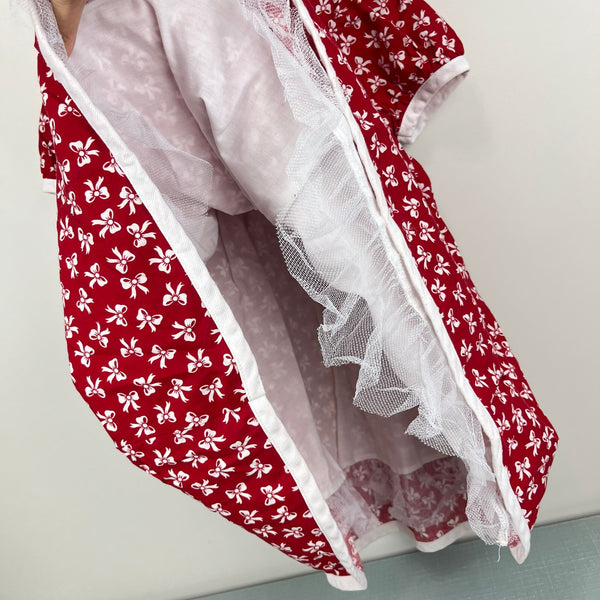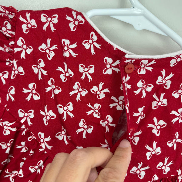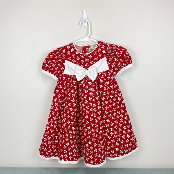 Vintage 90s Y2K Girls Rare Editions Red Bow Party Dress. Size tag faded, but is the same size as same style Rare Editions size 6 dress. Short sleeve dress with white bow print and big bow at the chest. Missing one button in the back (see photo; generic and easily replaced, but functions fine as-is) and small mark at hem (see photo; untreated). Nice full skirt. Perfect for the holidays or a birthday party!