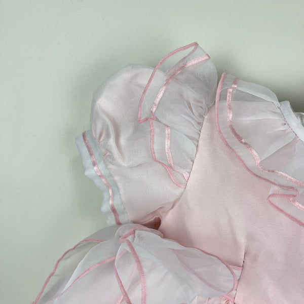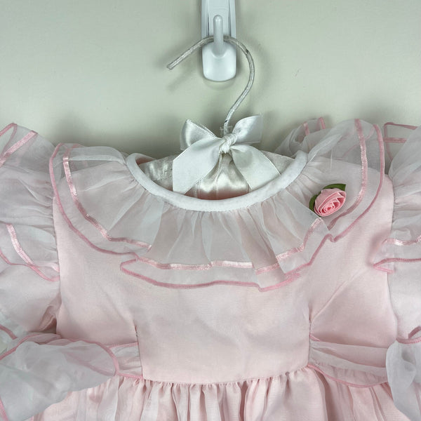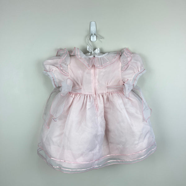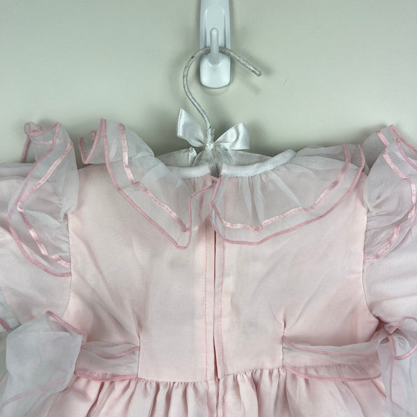 Vintage Sylvia Whyte Pink Party Dress. Baby toddler girl size 18 months. Stunning light pink special occasion dress. Sheer ruffle collar with flowers. Zipper in the back and sashes to tie bows on each side of the waist. Layered skirt. Perfect for Easter, a birthday party, or summer wedding! Coordinating big sister dress (size 6) available separately!