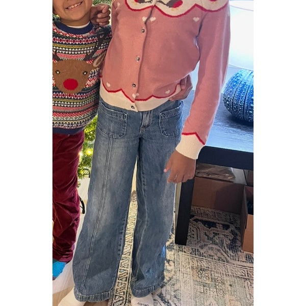 Abercrombie and Fitch Kids High Rise Ultra Wide Leg Jeans. Girls size 9/10 long. Trouser style lightweight denim pants with patch pockets in the front and welt pockets in the back. Seams down the legs. Distressed for a more casual look, but still easy to dress up! Adjustable tabs in the waist. Great condition with no flaws noted. (Just wrinkled from being crammed in my daughters drawer; she loved these but outgrew quickly!) Retail $59.95.