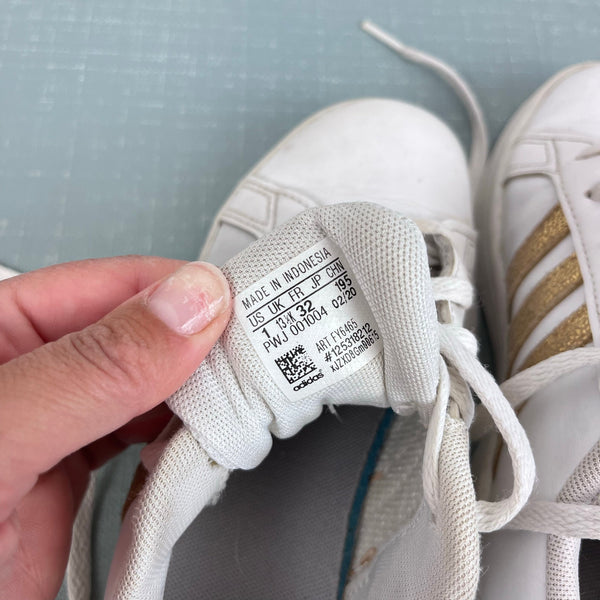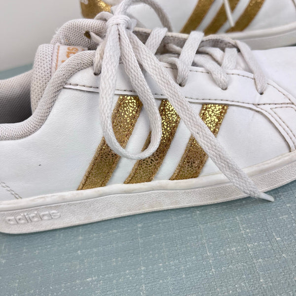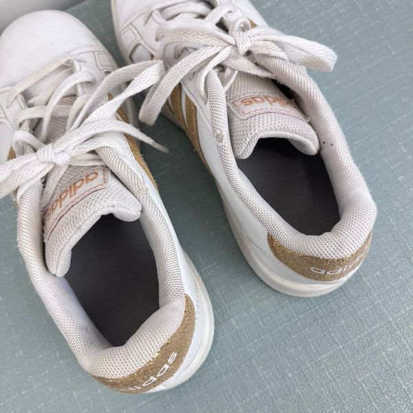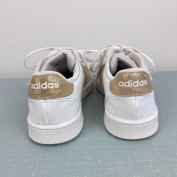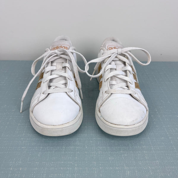 Adidas Girls Grand Court Sneakers White Gold. Girls shoe size 1. Classic style is perfect for every day wear to school! Some wear (see photos), but plenty of life left!