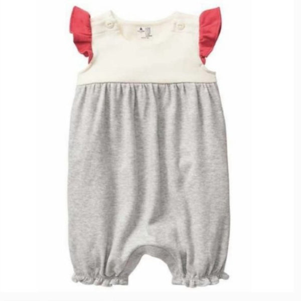 Baby Gap Red, White & Grey Romper. Baby girl size 0-3 months. Super soft one piece outfit. Red flutter sleeves, white top, and grey bottom. Snaps at legs and buttons on shoulders for easy dressing and diaper changes. So cute for summer!