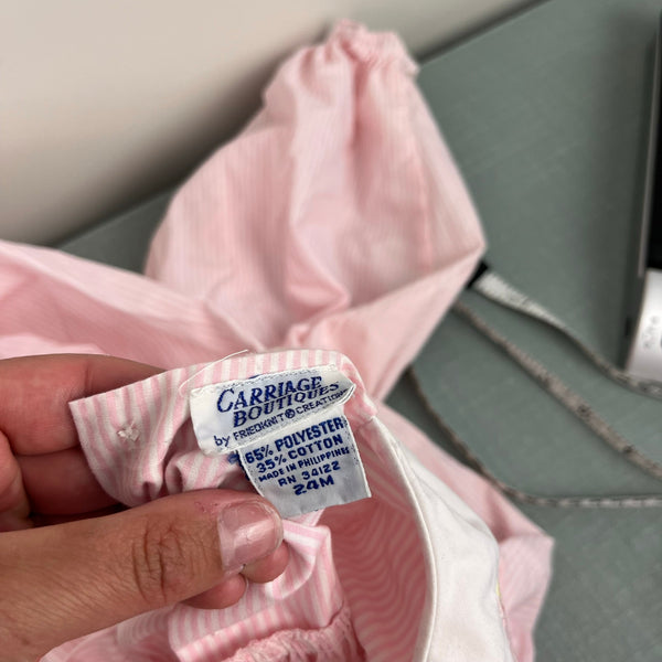Carriage Boutiques Smocked Pink Sailboat Jumpsuit. Baby toddler girl size 24 months. The cutest one piece romper outfit! Short, puff sleeve top and long pants bottom. Pink and white stripes with smocking across the chest and applique boats on the bib collar. Buttons and sash to tie a bow in the back. Elasticized cuffs. A couple tiny marks (see last photo; untreated), but otherwise great condition! So sweet for summer!