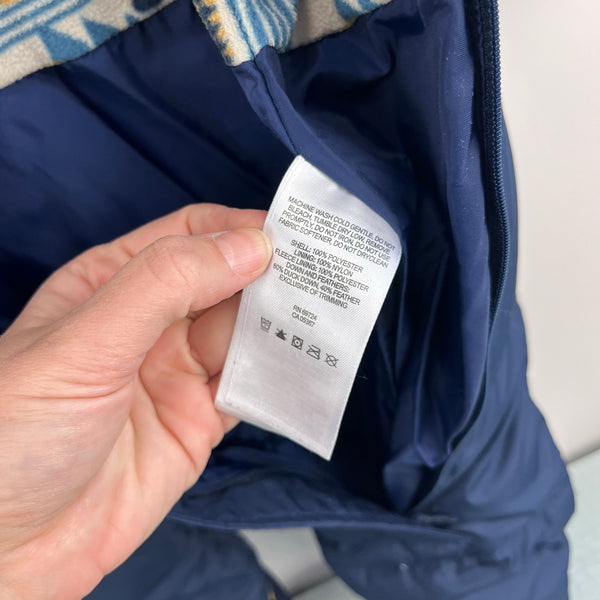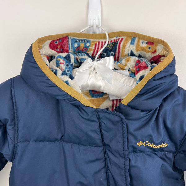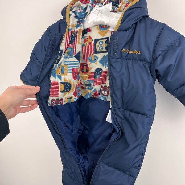 Columbia Infant Snuggly Bunny Down Bunting Snow Suit Navy Blue. Baby boy size 12-18 months. Cozy and warm one piece snowsuit. Navy blue. Features fixed hood, upper fleece lining, down insulation, long zipper for easy on/off, and fold over hands and feet to lock in body heat.