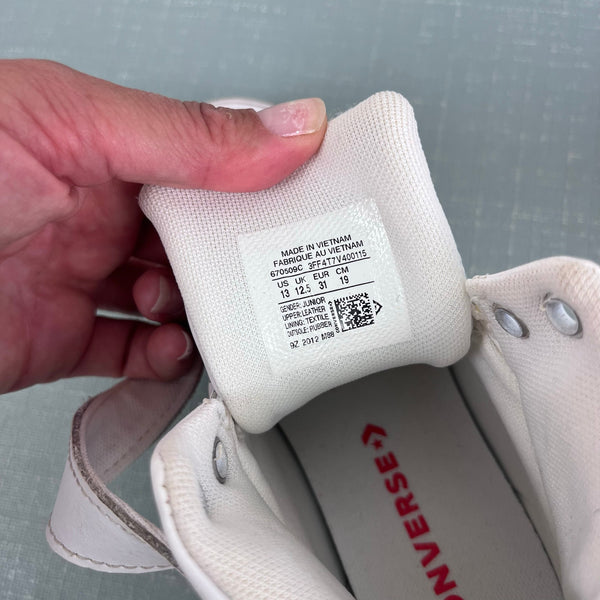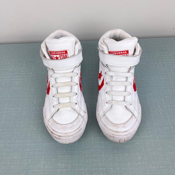 Converse Pro Blaze Strap Retro Sport High Top Kids Sneakers White Red. Boy or girl shoe size 13. Features durable leather upper, SmartFOAM cushioning, ankle strap and elastic laces for easy on/off, padded tongue and collar, and fun red star chevron design. Great condition; just has light marks from the one of two times my kiddo wore.