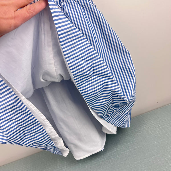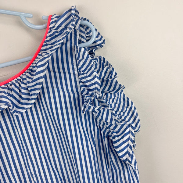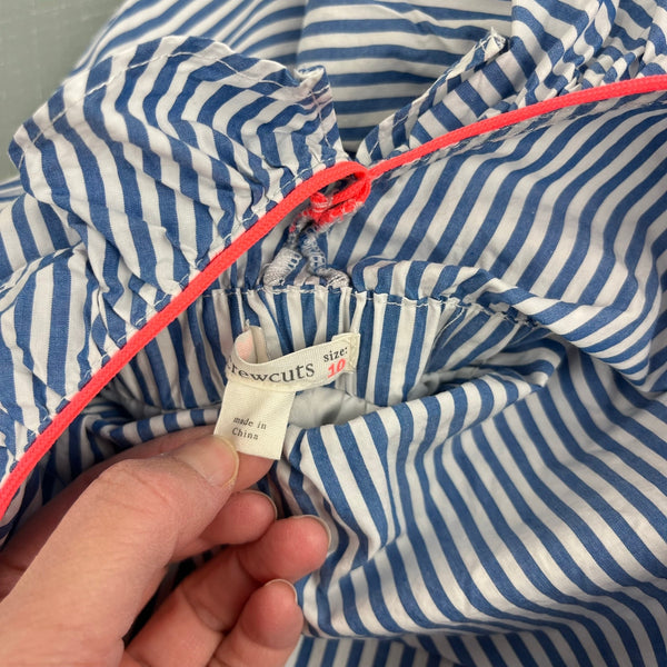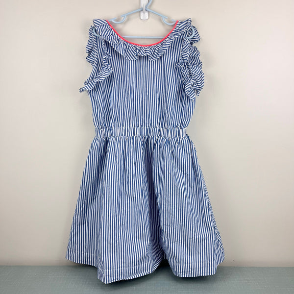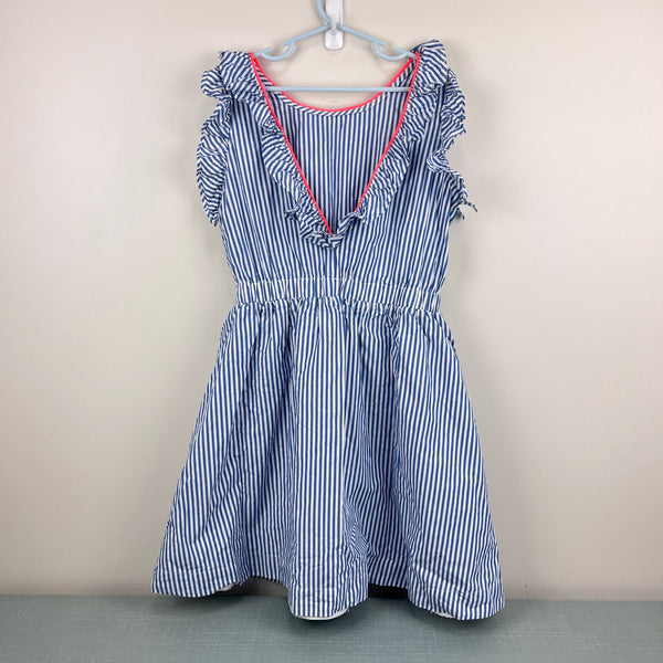J. Crew Kids Girls' Ruffle Dress in Blue Shirting Stripe. Girls size 10. Sleeveless blue and white striped dress with ruffles. V-back. Lined skirt. Elasticized waist. Fun pop of collar at the neckline. Great condition with no flaws noted. Perfect for summer!
