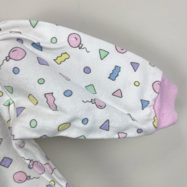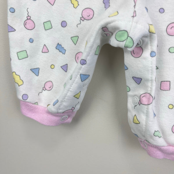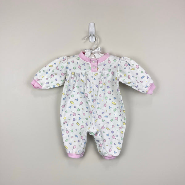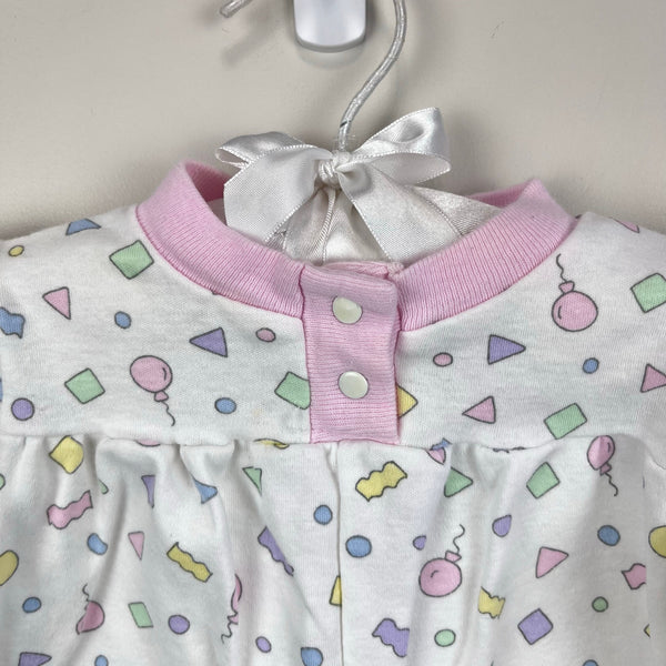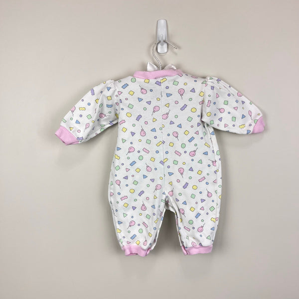 Fisher-Price Kidswear Pastel Confetti Coverall Romper. Baby girl size newborn. USA made. Adorable one piece outfit. White with pink cuffs and colorful print with shapes and balloons. Snaps in the front and along the legs for easy on/off. Great condition with no flaws noted!