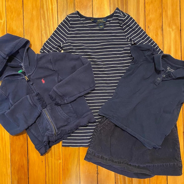 Girls Navy Blue 4 Piece Uniform Bundle. Lot includes Ralph Lauren sweatshirt and long sleeve dress, The Children's Place short sleeve polo shirt, and Crewcuts (J. Crew) corduroy skirt. Best fit for 4/5. (Sweatshirt is tagged a 6, but runs small.) Great for every day wear to school. Light wear; no major issues noted.