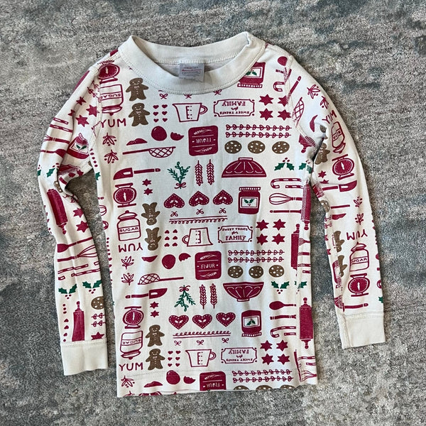Hanna Andersson Christmas Cookie Long John PJs. Toddler girl or boy size 110 cm (US 5T). Cream colored two piece fitted pajama set with festive red print featuring gingerbread man cookies, candy canes, utensils, and holly.