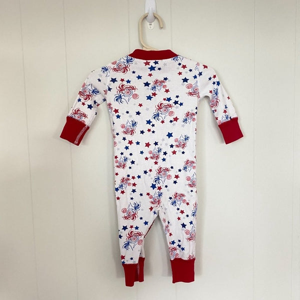 Hanna Andersson Red, White and Blue Fireworks Pajamas. Unisex baby boy or girl size 60 cm (US 6-9 months) These PJs are the best! Like all Hanna Andersson sleepers, these are well made and will last a long time. We love these because they always have a perfect, snug fit. Full zip down one leg makes these easy to get on and off. Perfect for baby's first 4th of July!