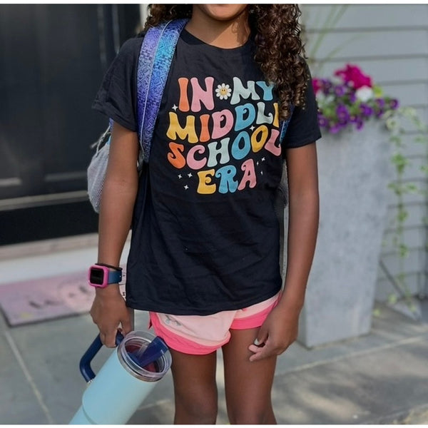 In My Middle School Era Short Sleeve Tee Shirt. Girls size medium. I can't find the original size chart, but probably around a 10. Taylor Swift inspired casual short sleeve black top with colorful bubble lettering and a smiling flower. Perfect for the last day of 5th grade/elementary school (or first day of middle)! I think worn just the one time.