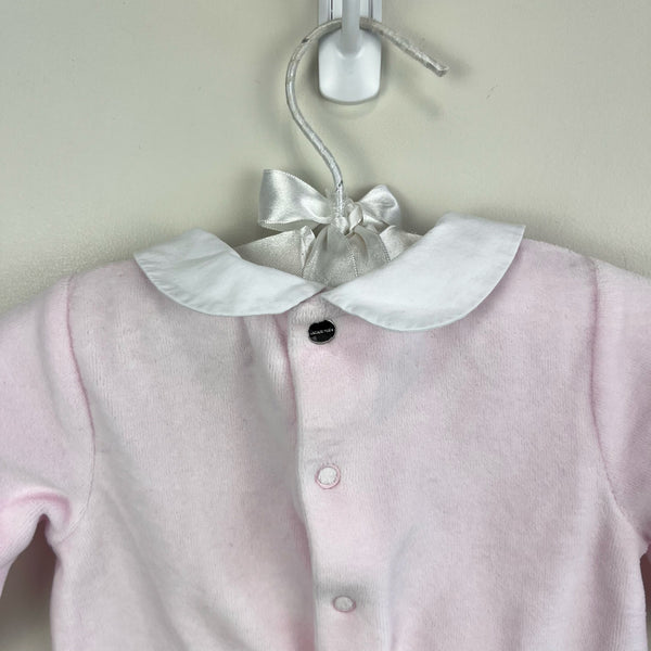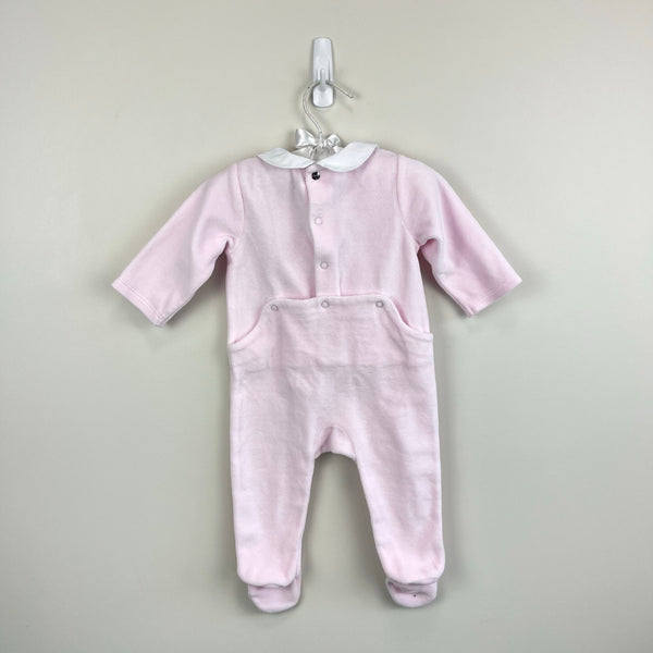 Jacadi Paris Footie Pajamas in Velvet Bouclette Pale Pink Bunny. Baby girl size 6 months. Cozy one piece velour footed coverall outfit with snaps in the back. White collar and bunny rabbits on the chest. Care tag removed, but no other flaws noted. Perfect for Easter and all spring long!