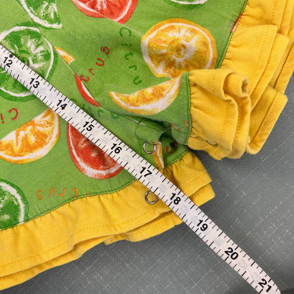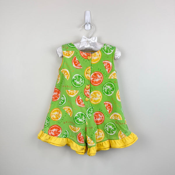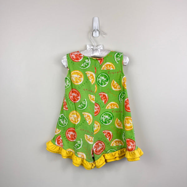 KHQ Kids Headquarters 90s Y2K Sportswear Green Ruffle Citrus Fruit Shortall Romper. Toddler girl size 2T. Sleeveless one piece outfit. Lime green with ruffle hem and fun print with orange, lime, and lemon slices. Fun heart buttons in the front and snaps at the bottom for easy on/off. Tiny mark (see last photo; untreated).