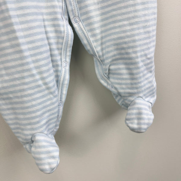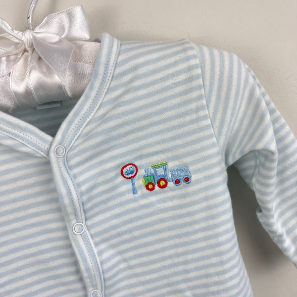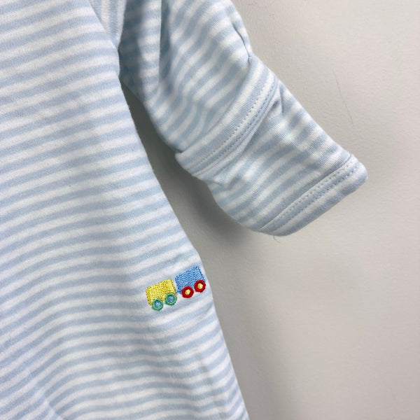 Kissy Kissy Blue Stripe Train Footie. Baby boy size 0-3 months. Super soft pima cotton one piece footed coverall outfit. Light blue and white stripes with embroidered trains. Fold over mitten cuffs and snaps down the front. Tiny spot (see photo; untreated), but otherwise excellent condition. Perfect for every day sleep or play!
