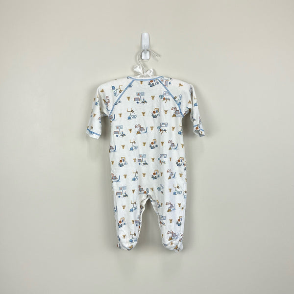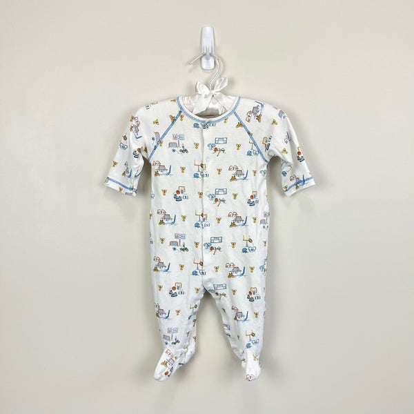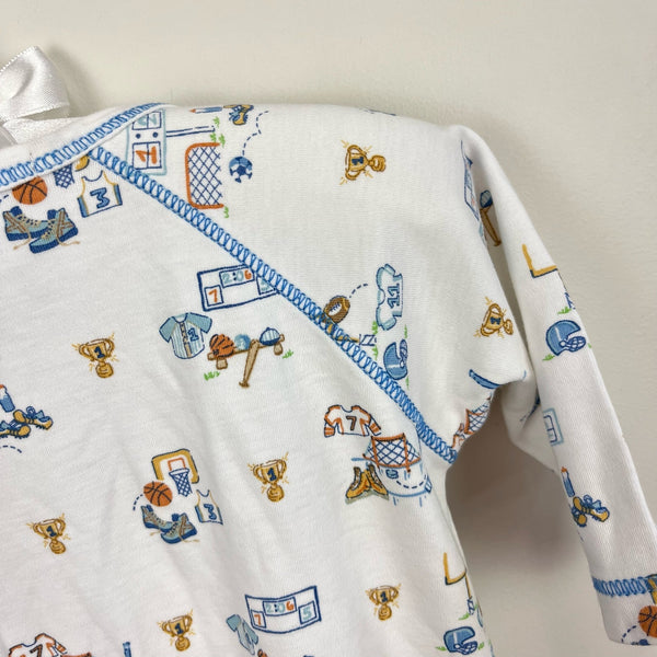 Kissy Kissy Sports Footie. Baby boy size 6-9 months. Super soft pima cotton one piece outfit. White with assorted sports equipment - soccer balls, baseball bats, and more. Snaps down the center for easy on/off. Maybe super faint discoloration at neck (see photo), but otherwise great condition. Perfect for sleep or play!
