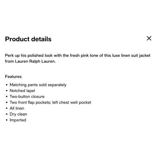 Features: Notched lapel Two-button closure Two front flap pockets; left chest welt pocket 100% linen