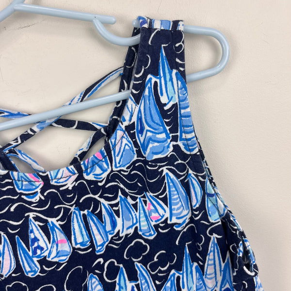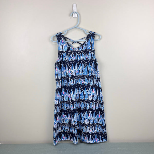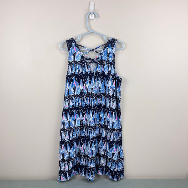 Lilly Pulitzer Girls Mini Kristen Swing Dress Low Tide Navy Sails and Stripes. Girls size large (8-10 years). Casual sleeveless dress. Nautical theme - navy blue with light blue and pink sailboats. Lattice back. Excellent condition. Retail $64.