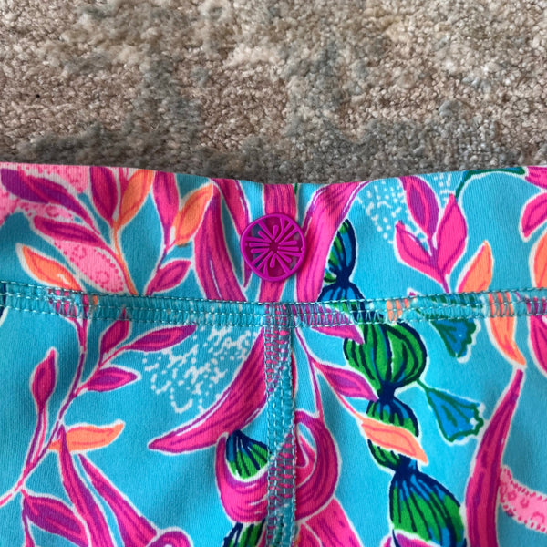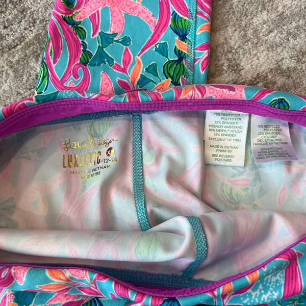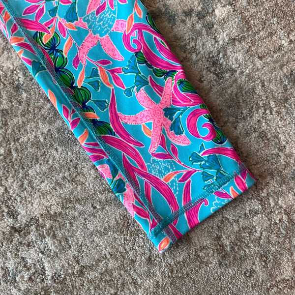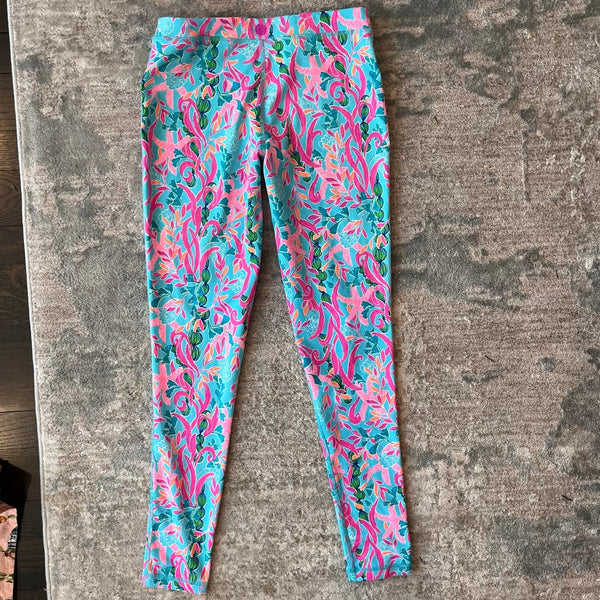 Lilly Pulitzer Luxletic Girls Mini Weekender Legging Multi Seaweed Samba. Girls size extra large (12-14 years). Super soft and durable athletic leggings. Features studio stretch moisture wicking material with UPF 50+sun protection. Pretty pink, blue, green, and orange print with seaweed and starfish. Excellent condition. Retail $68.