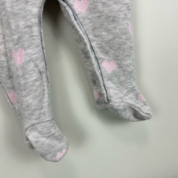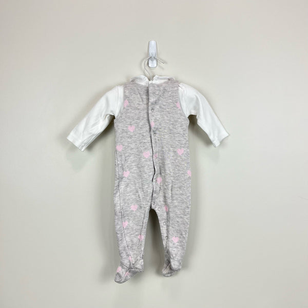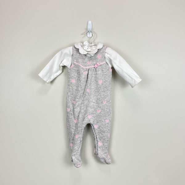 Mayoral Baby Gray Heart Footie. Baby girl size 4-6 months. One piece romper outfit designed to look like coveralls and blouse. White scallop collar and sleeve. Pink hearts. Faint discoloration at collar (untreated and I'm sure would come out; see 2nd photo) but otherwise excellent condition.