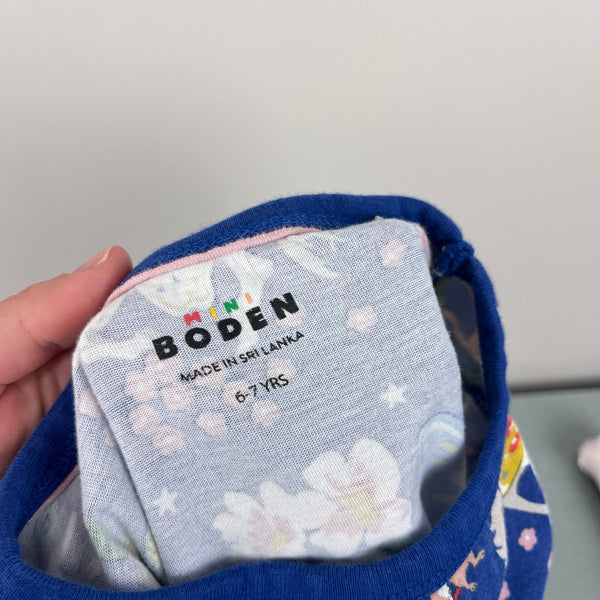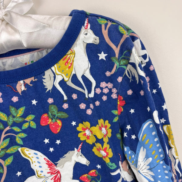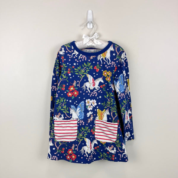 Mini Boden Blue Enchanted Unicorn Jersey Pocket Tunic Dress. Girls size 6-7. Long sleeve tunic top in fun print with unicorns, flowers, strawberries, and more. Red and white striped patch pockets. So cute paired with leggings! Great condition with light wear/navy fade; no stains, tears, etc.