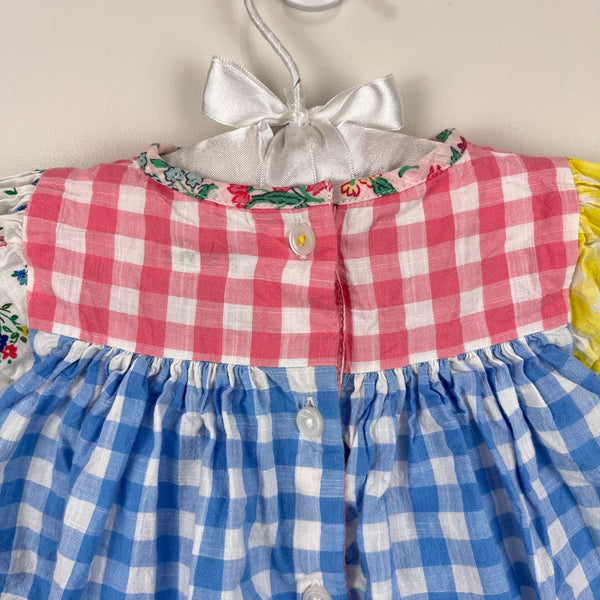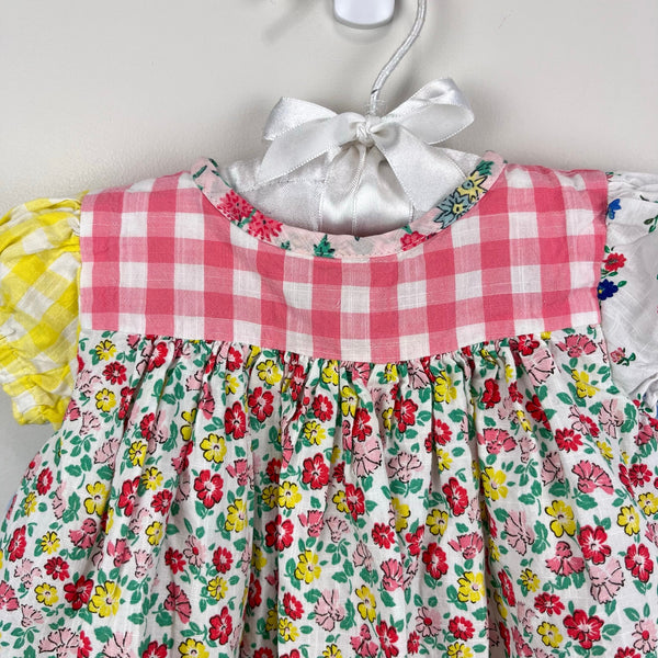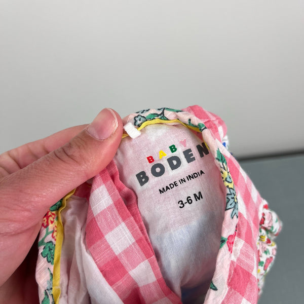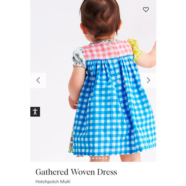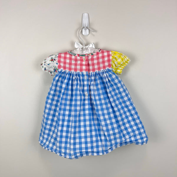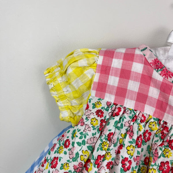Mini Baby Boden Gathered Woven Dress Hotchpotch Multi. Baby girl size 3-6 months. Adorable patchwork style dress with pink, blue, and yellow plaid, and floral fabric, too. Fully lined. Button back. Retail $65. Great condition with no flaws noted!