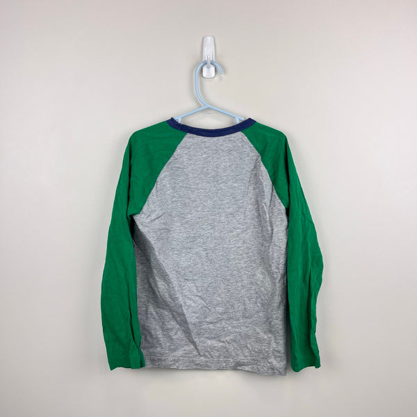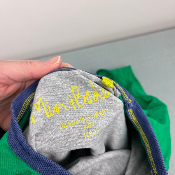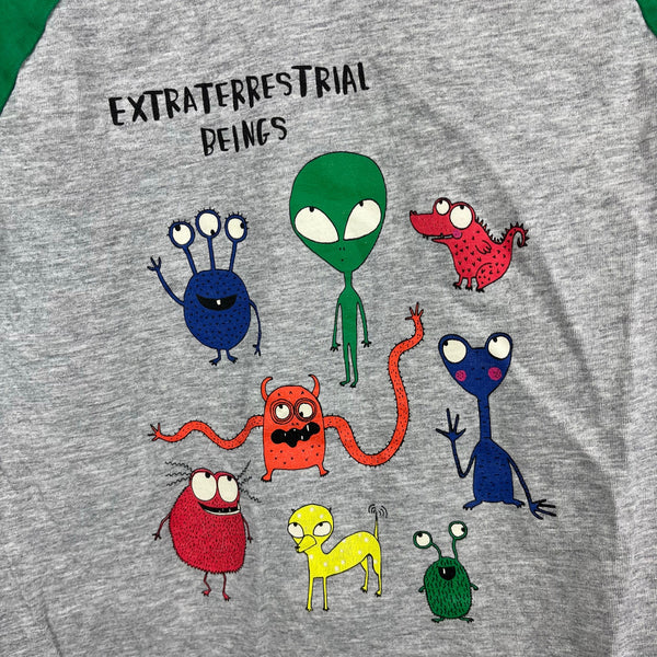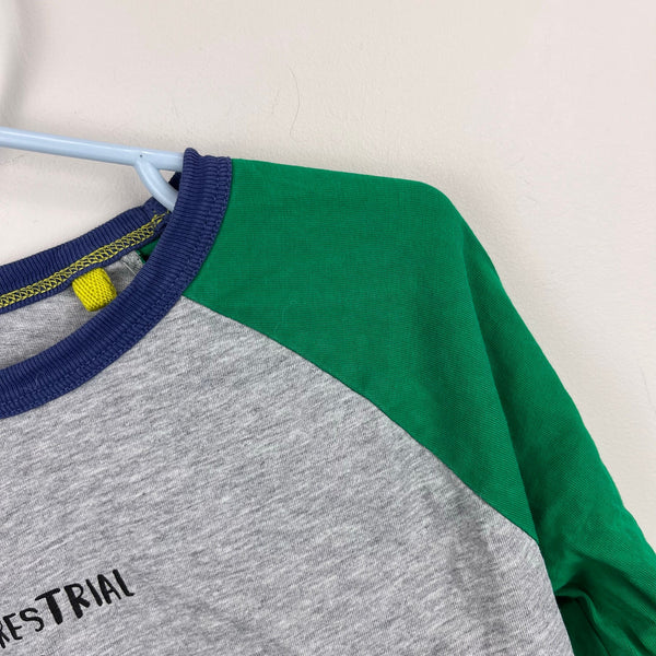 Mini Boden Glowing Space Raglan Tee Shirt Grey Marl/Green Aliens. Boys size 7-8 years. Long sleeve gray top with blue neckline and green sleeves. Fun extraterrestrial beings design. Great condition. Match for little brother (5-6) available separately.