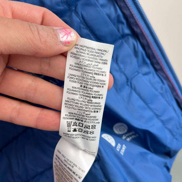Mini Boden Kids' Pack Away Padded Quilted Jacket Rockabilly Red. Boy or girl size 6-7 years. Bright red puffer coat with blue lining, fixed hood, and zippered hand warmer pockets. Water resistant and machine washable. Great condition with light wear to the elasticized binding. Folds up into its own pocket!
