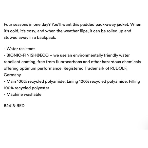Details: - Water resistant - BIONIC-FINISH®ECO – we use an environmentally friendly water repellent coating, free from fluorocarbons and other hazardous chemicals offering optimum performance. Registered Trademark of RUDOLF, Germany - Main 100% recycled polyamide, Lining 100% recycled polyamide, Filling 100% recycled polyester - Machine washable B2418-RED