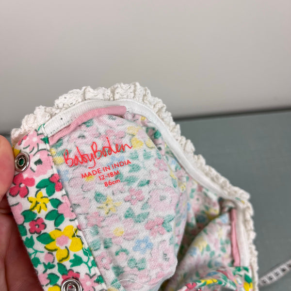 Mini Baby Boden Long Sleeve Floral Ruffle Collar Shirt. Baby toddler girl size 12-18 months. Super top in pretty flower print with ruffle detail at the neck and snaps in the back. Excellent condition with no flaws noted.