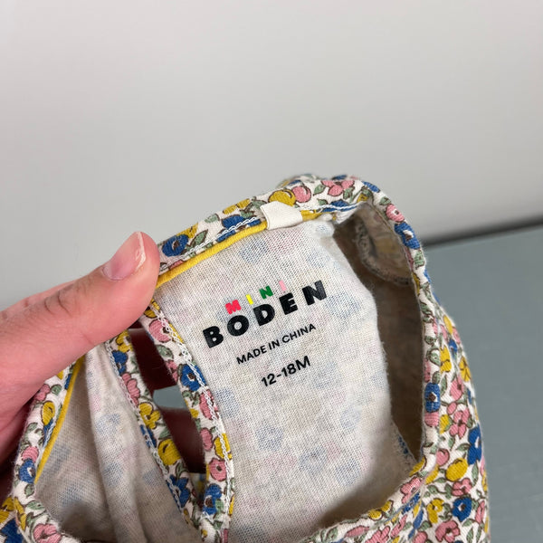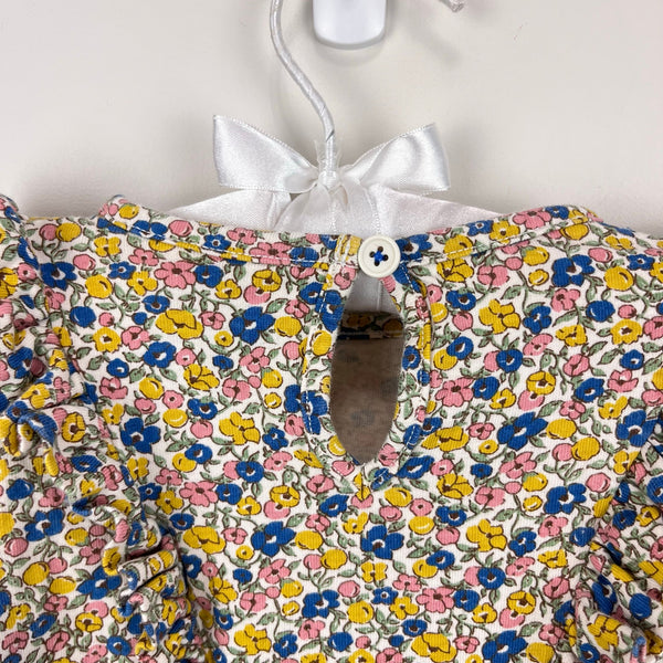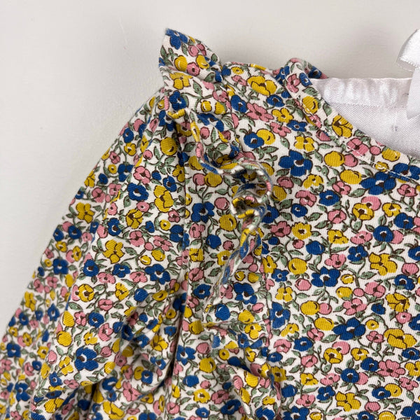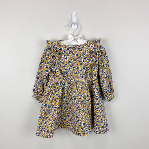Mini Boden Long Sleeve Ruffle Dress Multi Ditsy Floral. Baby toddler girl size 12-18 months. Cozy cotton long sleeve dress in pretty yellow, blue, and pink flower print. Fun ruffles at the shoulders down the front and back. Great condition with light wear.