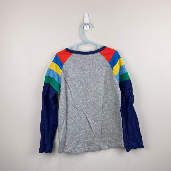 Mini Boden Rainbow Raglan Sleeve Tee Shirt. Boys size 9-10 years. Casual long sleeve cotton jersey top. Color block design. Gray with colorful red, blue, yellow, green, and navy striped sleeves. Excellent condition.