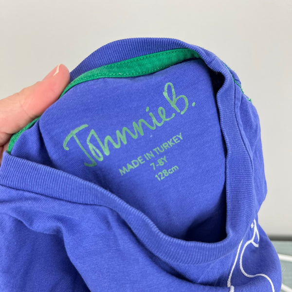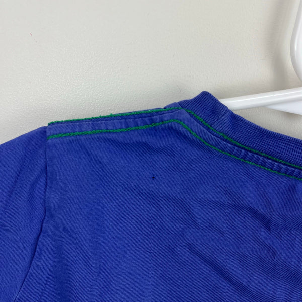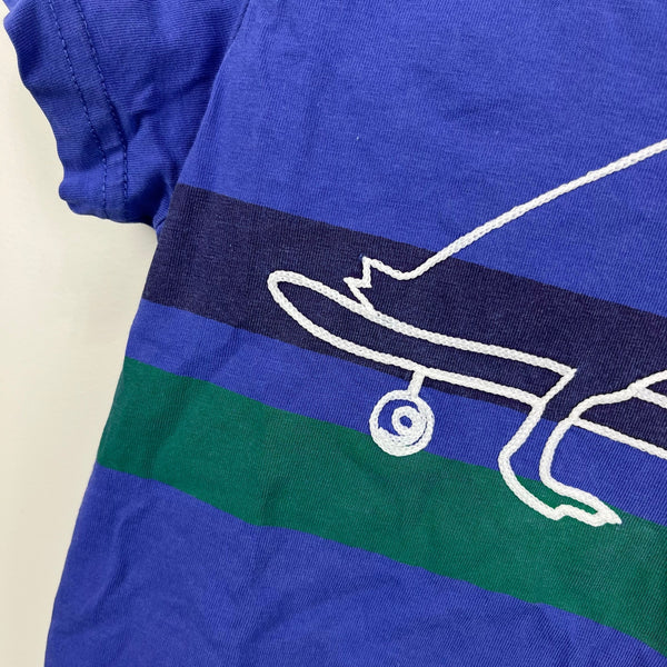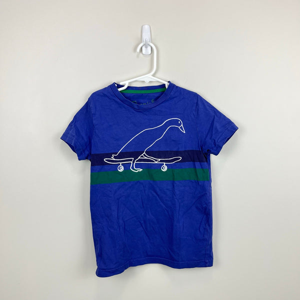 Mini Boden Short Sleeve Skateboarding Duck T-Shirt. Boys size 7-8 years. Casual short sleeve blue top with navy and green stripes across the chest. Fun braided rope deign of a duck on a skateboard. Has a few pinholes (see close up photos). Perfect for every day play!