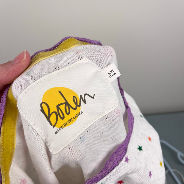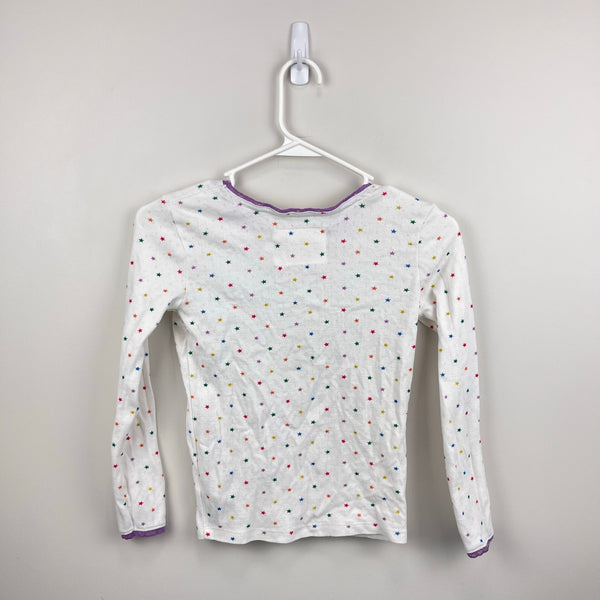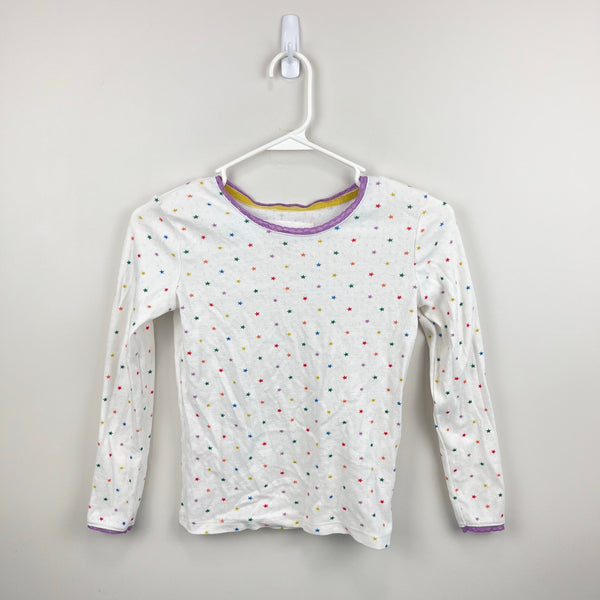 Mini Boden Supersoft Rainbow Star Pointelle Tee. Girls size 8-9 years. A wardrobe staple! Long sleeve white top with colorful polka dot star print and pretty purple lace detail at the cuffs and neckline. Excellent condition. (Don't think my daughter ever wore!)
