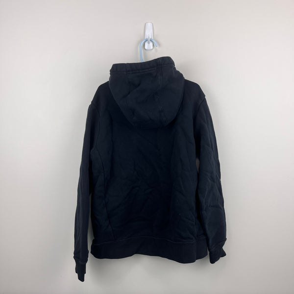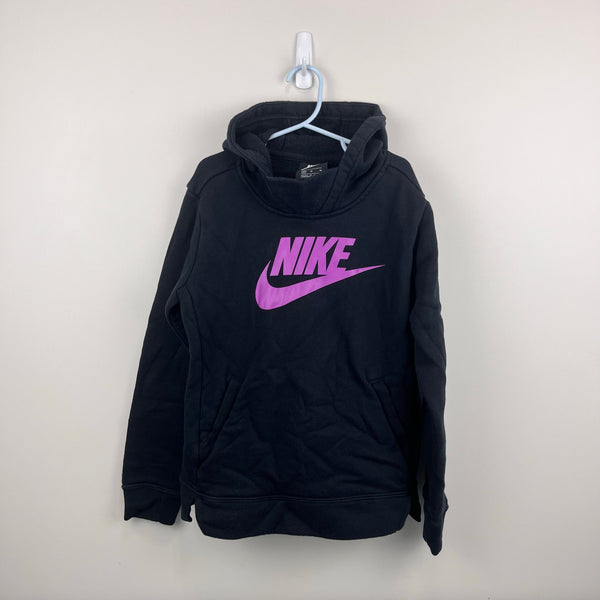 Nike Sportswear Club Fleece Big Kids' Pullover Hoodie Black Purple. Girls size medium (10-12 years per the size chart on the website). Cozy black hooded sweatshirt with kangaroo pocket and bright logo on the front. Great condition with no flaws noted (just wrinkled from being crammed in my daughter's drawer).