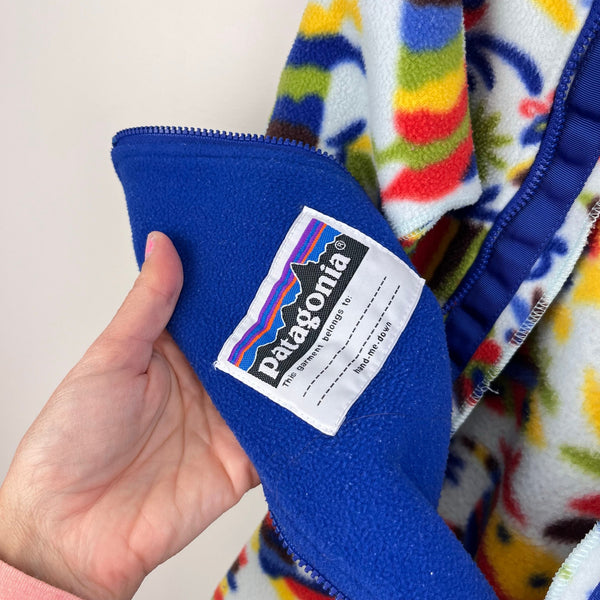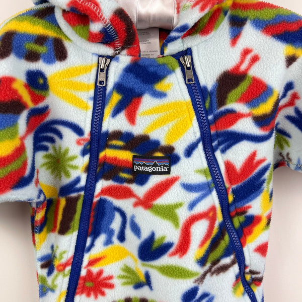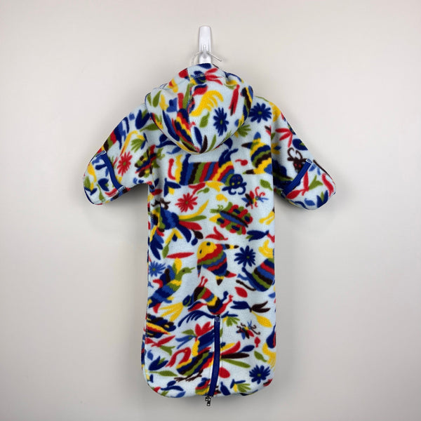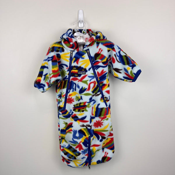 Patagonia Convertible Synchilla Fleece Bunting Animal Print Snow Suit. Baby boy or girl size 3 months. Light-weight, but warm extra layer. Double zipper for easy in and out. Zippers at bottom allow this to convert from a bag (great for the stroller) to a footie (great for the car or when baby wearing). Fixed hood and fold-over mitten cuffs. ID label inside. Retro, hard to find print features colorful birds and other fun creatures. Great condition with typical fleece wear.