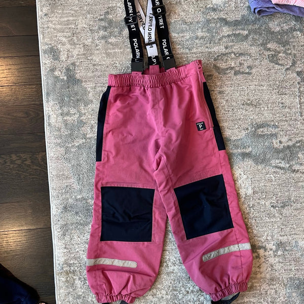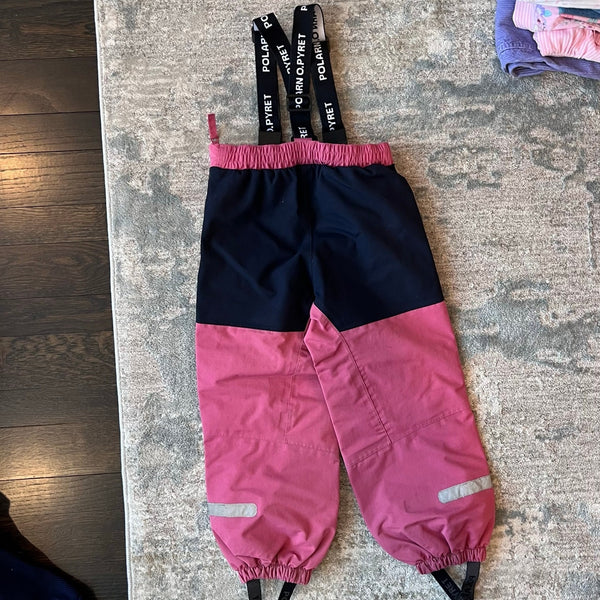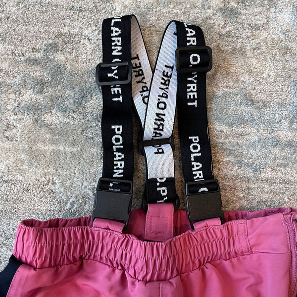 Polarn O. Pyret Sweden Kids PO.P WeatherPRO Waterproof Performance Ski Snow Pants Pink. Girls size 116 cm (US 5-6 years). Features super adjustable elasticized suspender straps, adjustable tabs in the waist, side zipper, elasticized waist, stirrups, reinforced knees and reflective strips on the front and back of the legs. Great condition with light wear/marks. High quality piece! Retail $138.